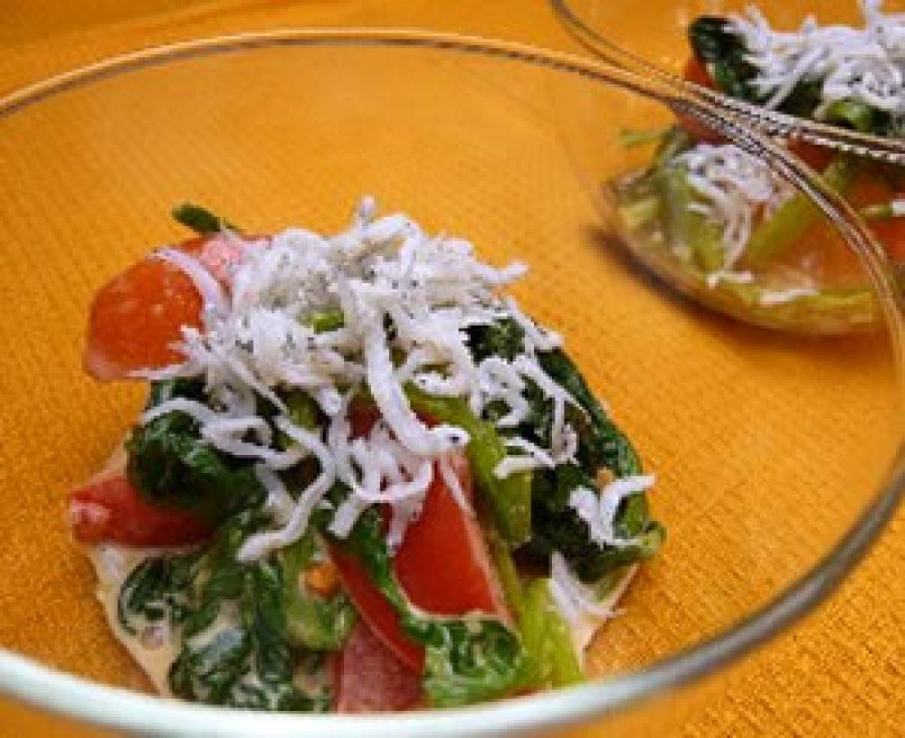 (4)にほうれん草とトマトを入れて、和える。