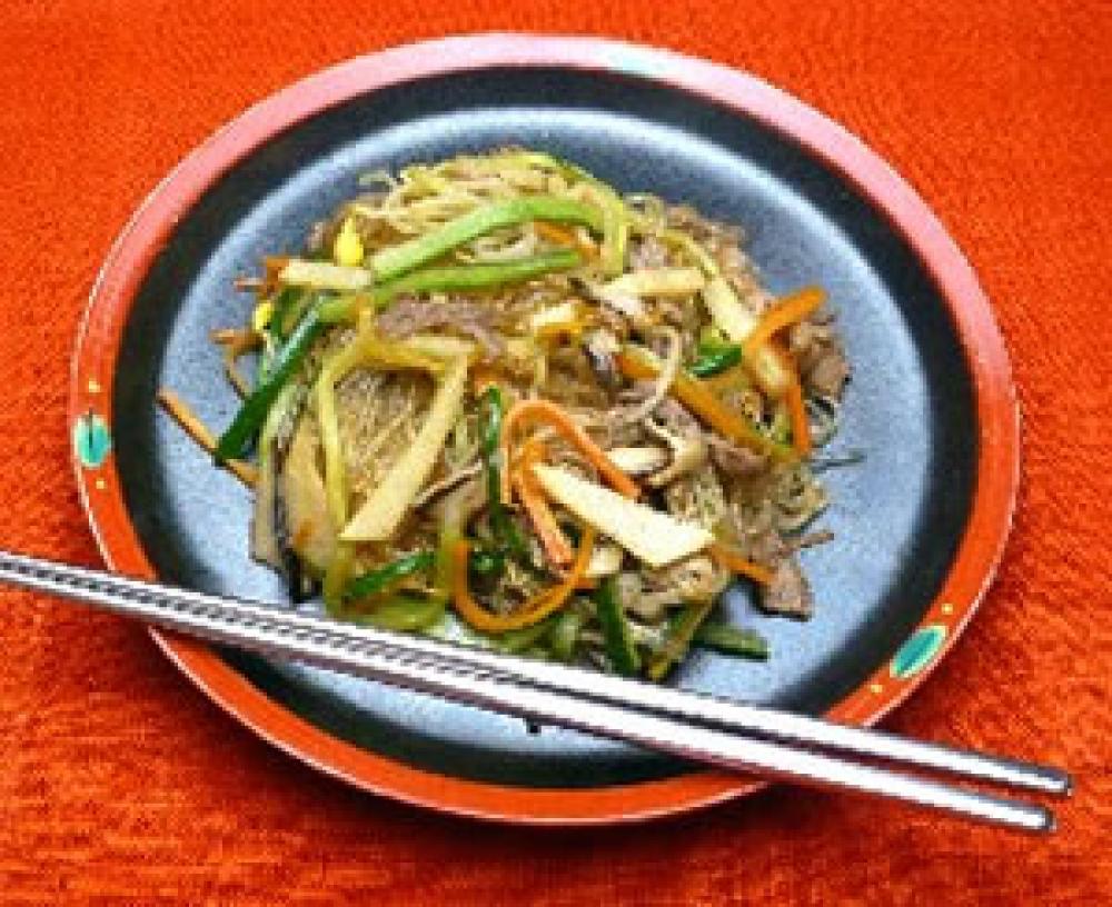 牛肉、しいたけは薄切りに、たけのこ、にんじん、きゅうりは4~5cmの細切りにする。