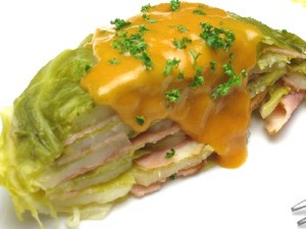 耐熱皿にキャベツを敷き、ベーコン、じゃがいも、キャベツを重ねていき、最後にキャベツでふたをする。