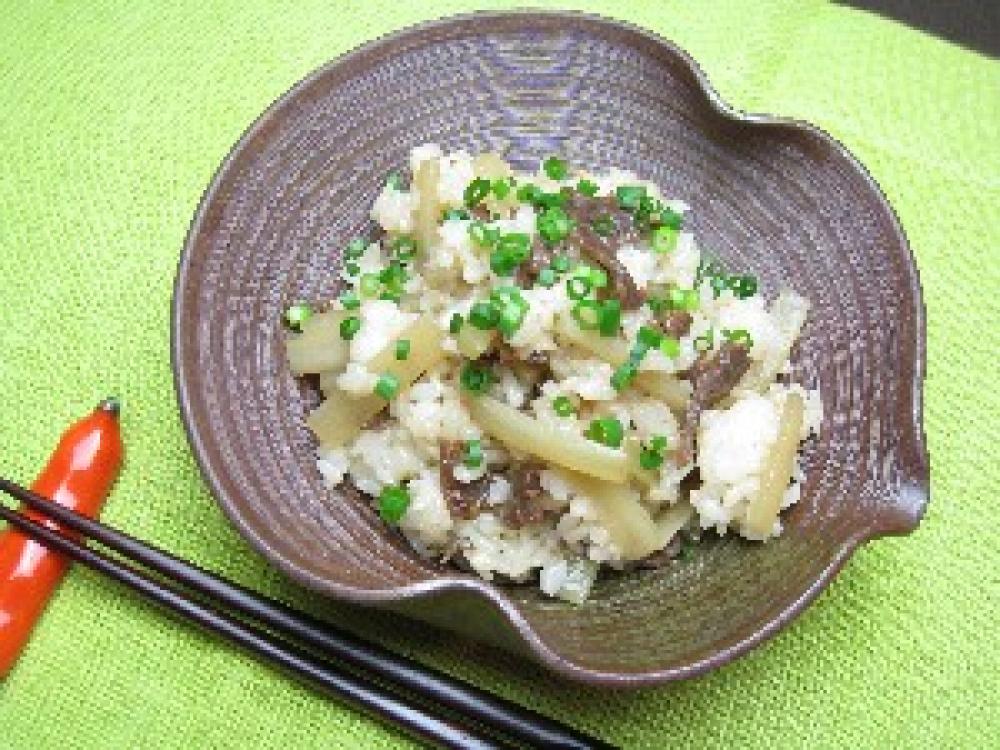 だし汁と調味料を鍋に入れて煮立て、うど、牛肉、しょうがを加えて煮る。