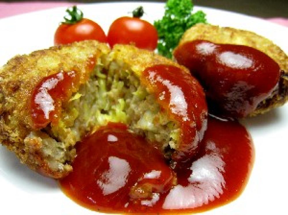 8等分に分け、形をととのえる。小麦粉、溶き卵、パン粉の順でつけ、170℃の油で揚げる。