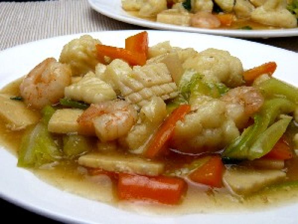 フライパンに油を熱し、いか、えび、キャベツを炒める。ある程度火が通ったら、カリフラワー、にんじんを入れ炒める。