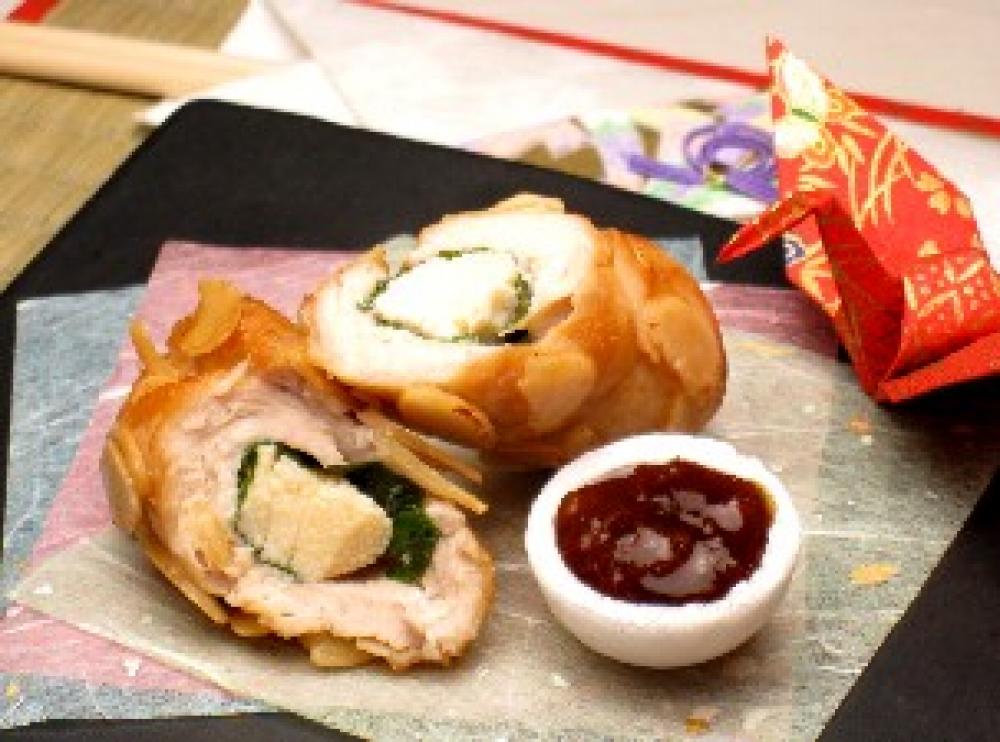 (1)に青しそと数の子をのせて巻き、片栗粉をまぶし、卵白をつけてアーモンドをしっかりとつけます。