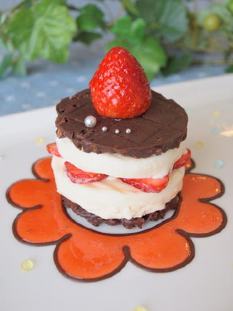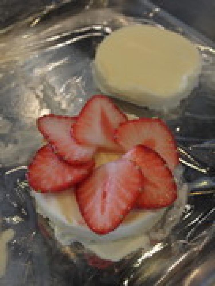 ![]() (1)のアイスがしっかり冷え固まったら、スライスしたイチゴを飾り、アイスクリームで挟む。