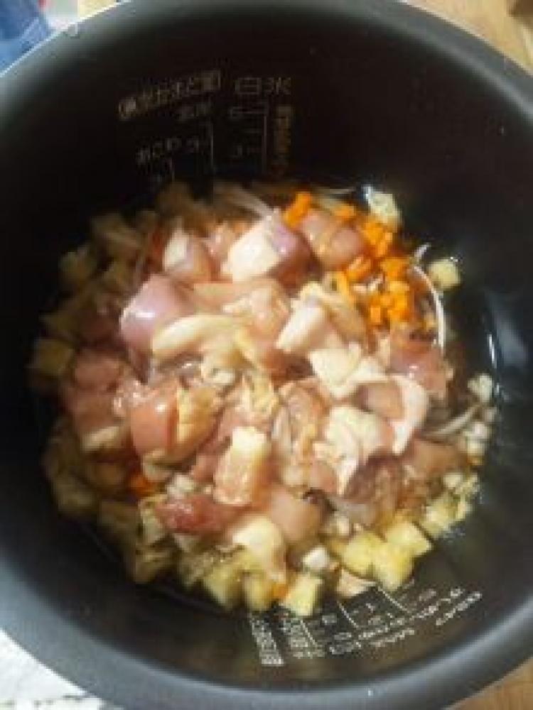 ![]() 米、水(少なめ)、☆を入れてから、野菜と鶏肉を入れる。かき混ぜない。