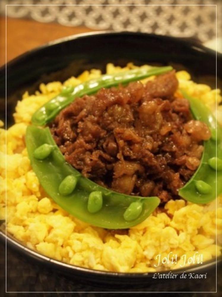 牛コマ切れ肉をお醤油とお砂糖で甘辛く焼いて乗っけました。