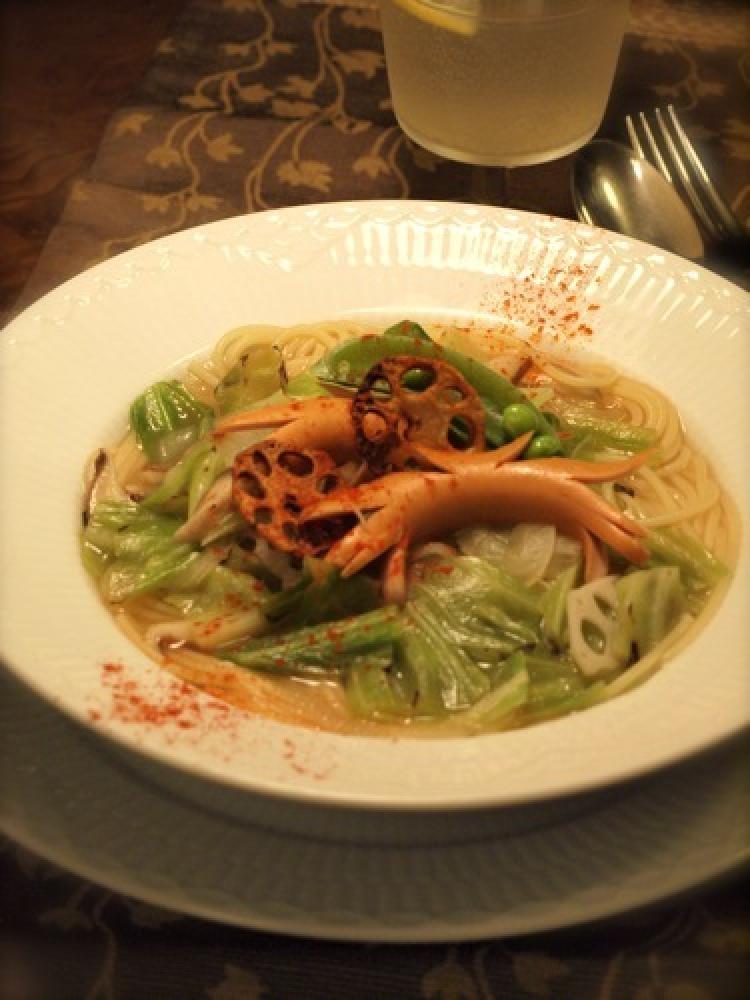 茹で上がったパスタのお湯を切ってお皿に盛って、具入りのスープを注いで出来上がりです。