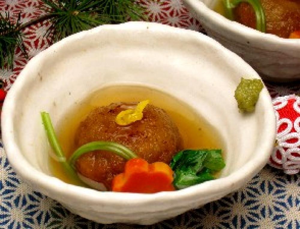 椀に蓮根饅頭を入れ、出汁をかける。にんじん、三つ葉、ゆずを飾り、わさびを添える。