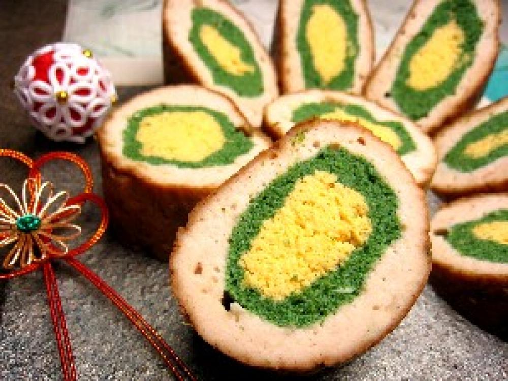 ラップの上に(2)を広げて、中央に黄身を置き、筒状にくるむ。