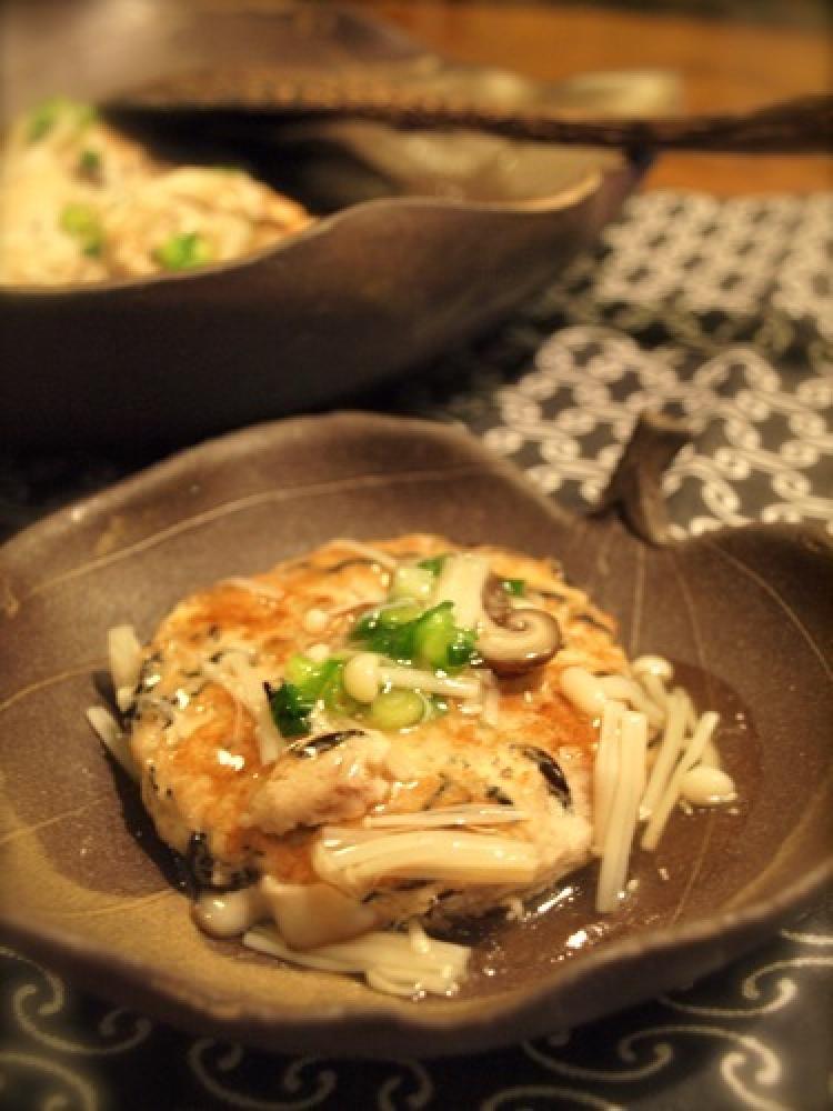 かつお出汁の和風ベースのきのこ餡かけをかけていただきました。