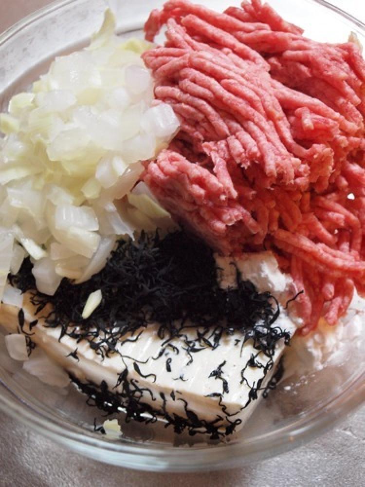 ![]() お豆腐は少し水切りして、ひき肉とレンチンのたまねぎとひじき、塩こしょうにつなぎの片栗粉を入れて混ぜ混ぜ。