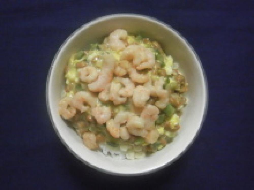 丼に白飯を盛り、揚げ玉を全体にトッピング。③のタルタル風納豆ソースをかけ、ボイルした小エビをのせる。