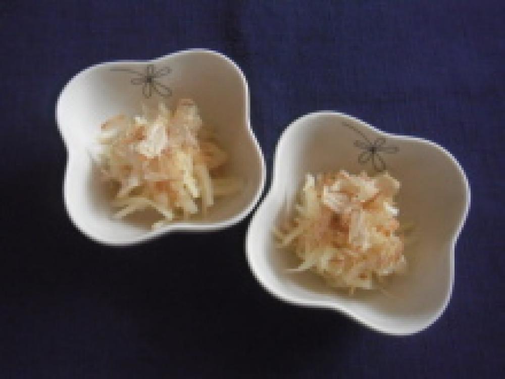 千切りした筍と、たたいた梅干し、大根おろしを和え、盛り付ける。かつお節をのせ、醤油をかけていただく。