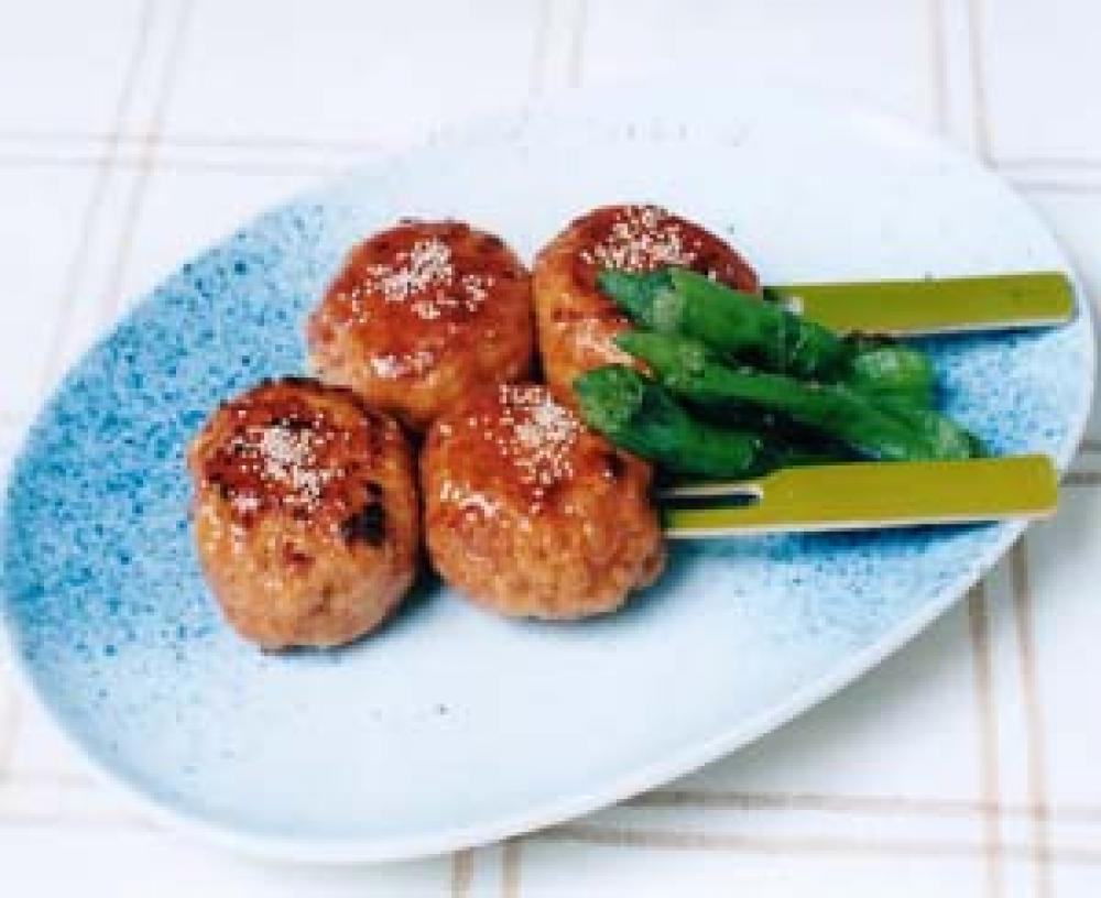 (2)にねぎ、生姜の絞り汁、卵、酒、しょうゆをいれてさらによく混ぜ、1個を35g位に丸める。