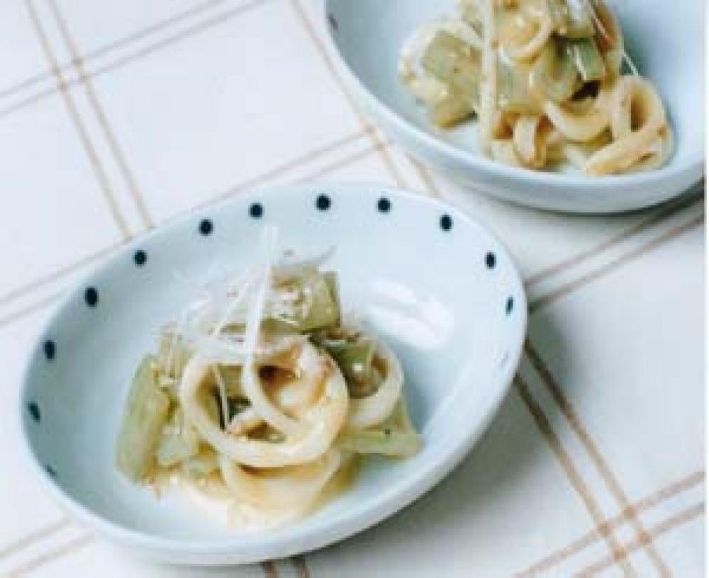 ボウルにふきとするめいかを入れて辛子酢みそで和える。