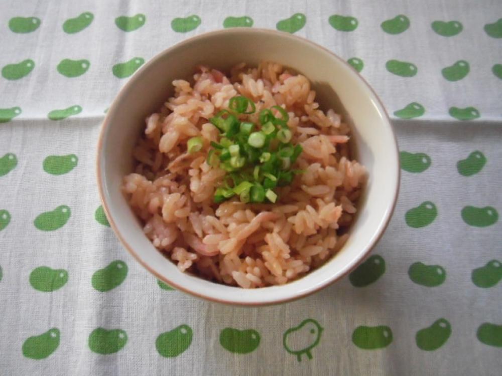 干し桜海老、しらす、バターを入れ、偏らないよう軽くまぜ、普通に米を炊く要領で炊飯する。