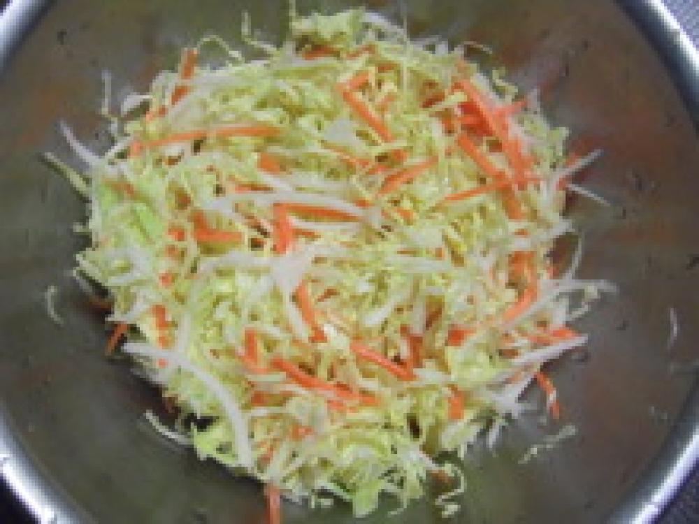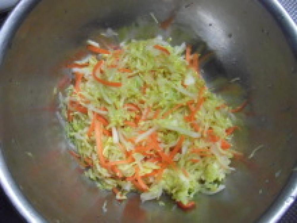 ![]() キャベツは千切りに、人参は長さ4センチ程に切り、千切りする。