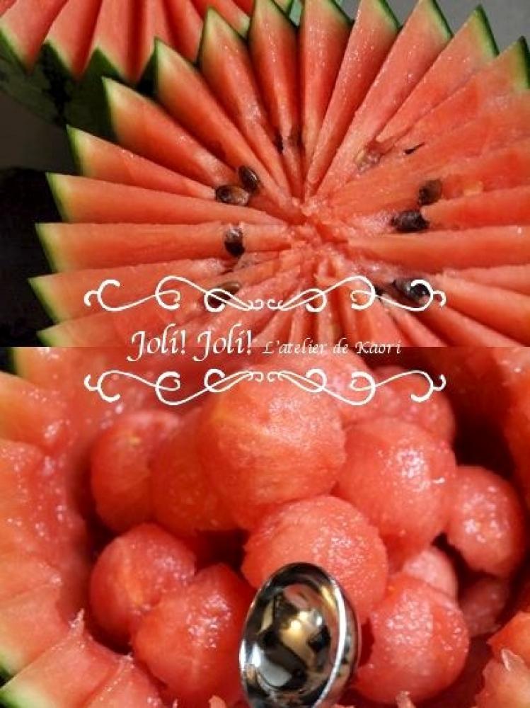 スイカを半分に切って、中身を丸くくりぬきます。
