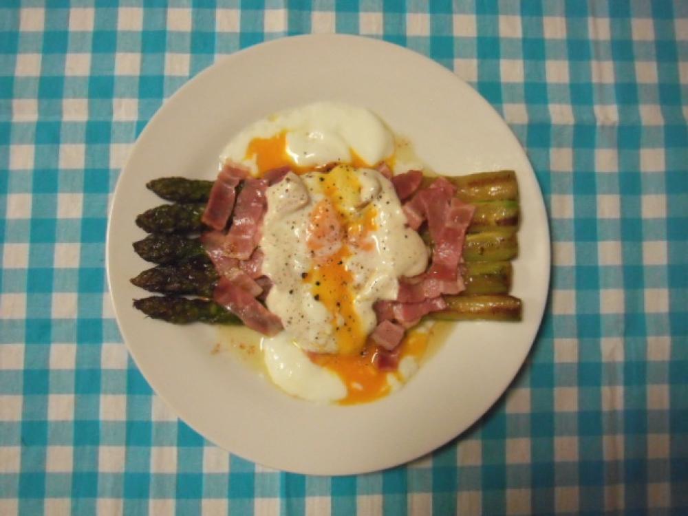 アスパラが焼きあがったら、ベーコンとともにお皿に盛り付け、⑤のソースをかけ、温泉卵をのせ、仕上げにブラックペッパーをふる