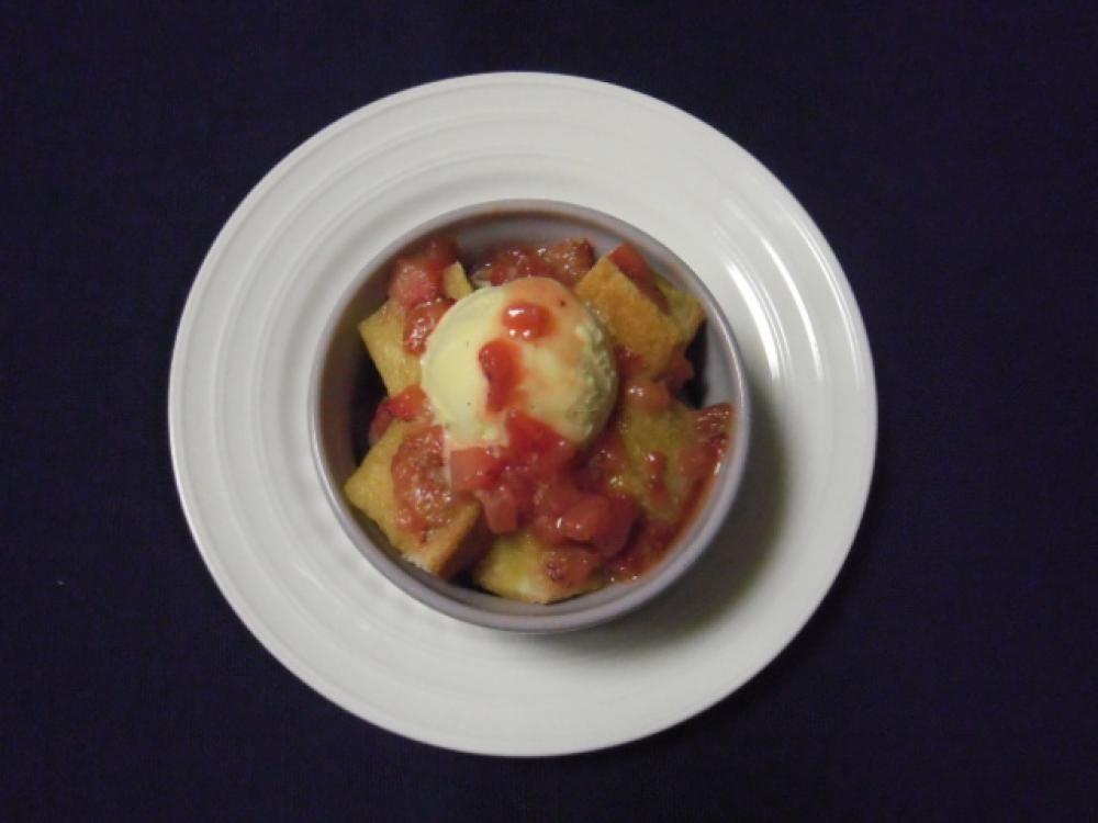 トッピングでアイスクリームと苺ソースをかける。