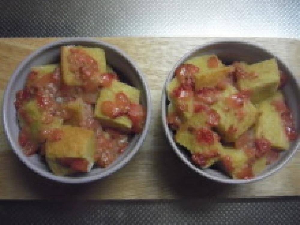 溶かしバターをココットの内側に塗り、2㎝角程に切った食パンをココットに入れる。