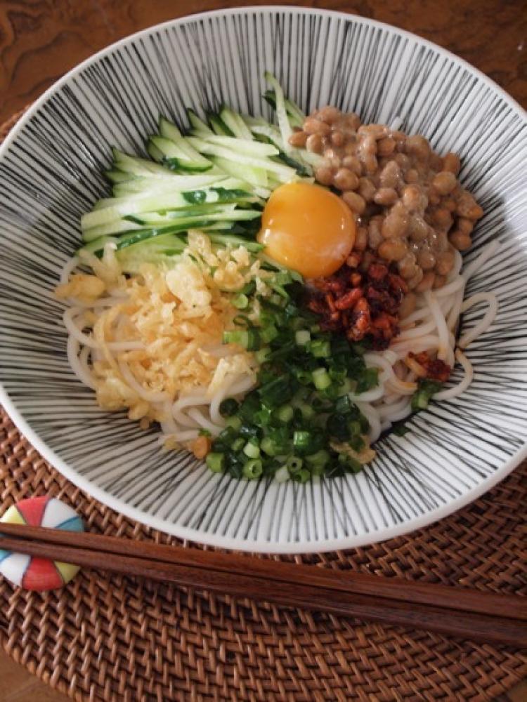茹でたそうめんの上に具材をトッピングして、最後につゆをかけて完成。 |