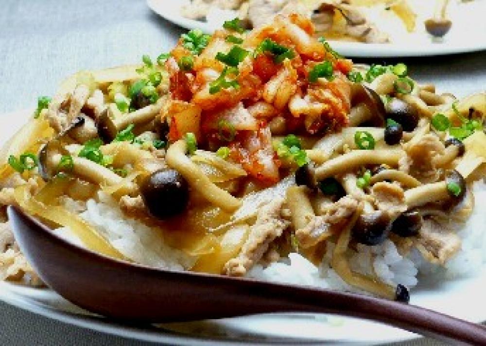 丼にご飯を盛り、上から(3)をかけ、上にキムチをのせ、青ねぎをかける。