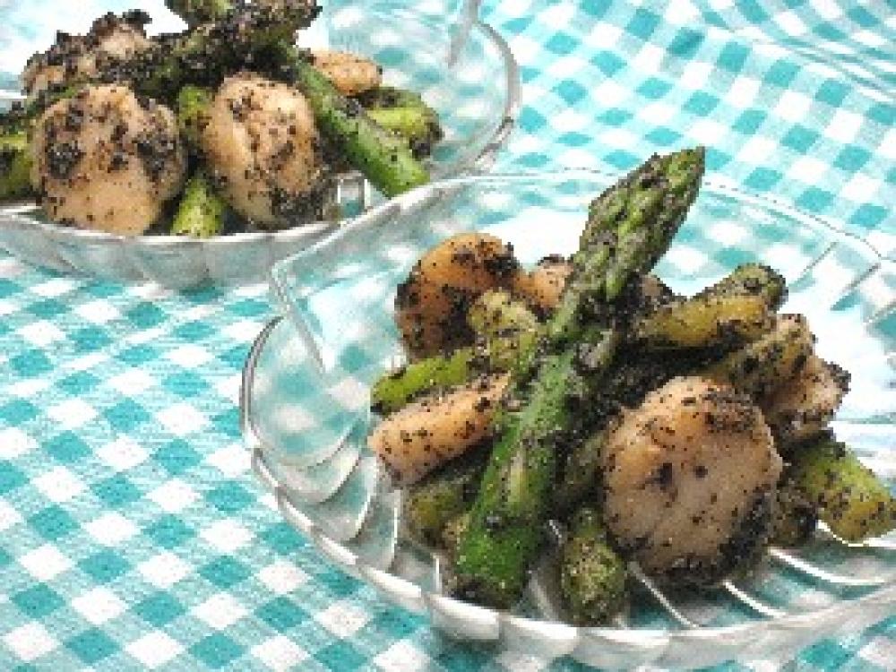 フライパンでアスパラとホタテ、を炒める。