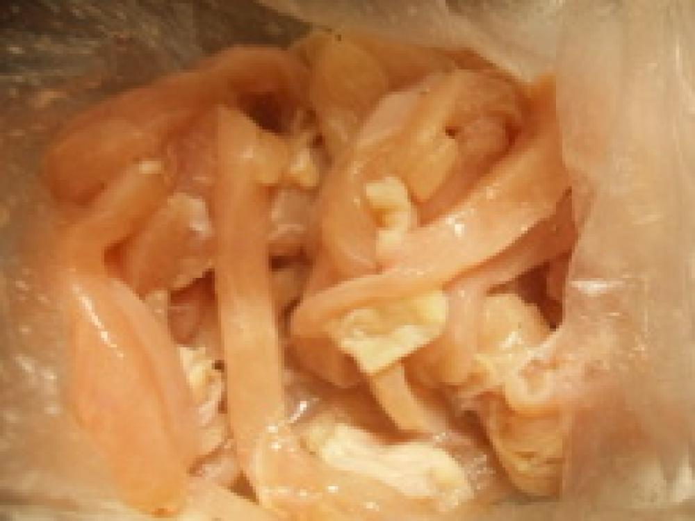 ![]() ピーマンは細切り、☆を合わせておく。鶏むね肉をそぎ切りにしてから細切りにし、◇をかけて置いておく。