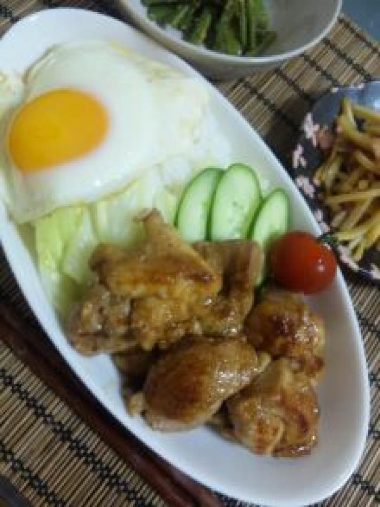 今日はご飯、キャベツ、キュウリ、プチトマト、目玉焼き。最後に分量外のタレをかけたら完成。