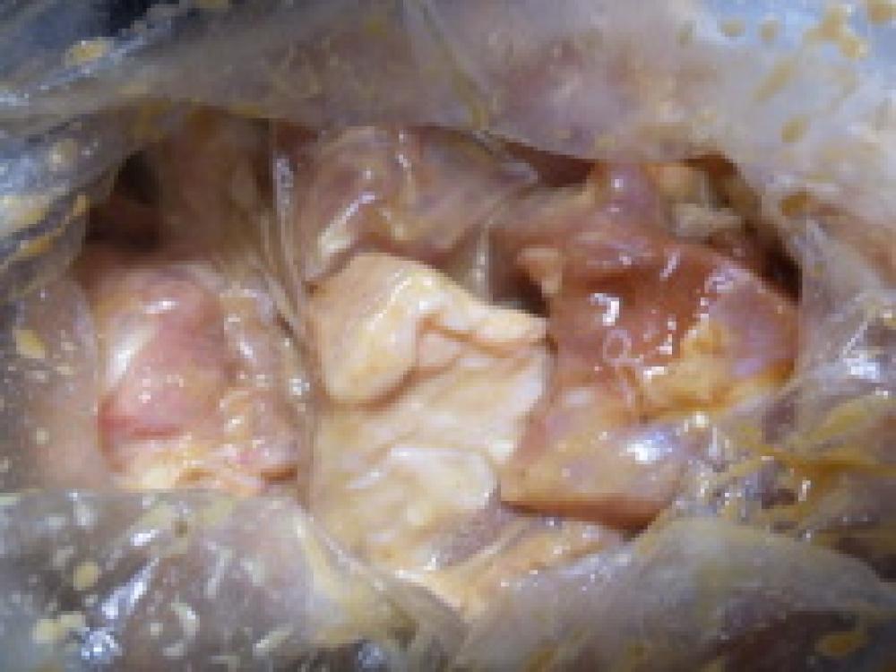 ![]() 鶏肉を1口大に切り、ヨーグルト、焼肉のタレに漬け込む。