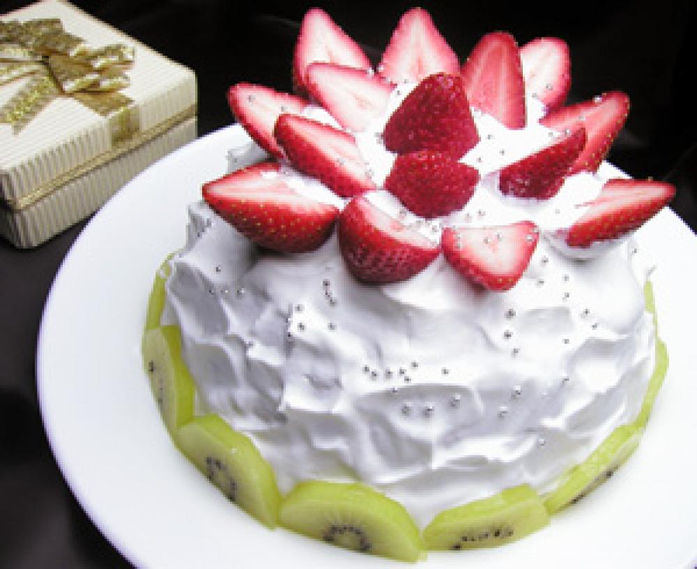 残した半量の生クリームを全体に塗り、フルーツで飾りつけて出来上がり。
