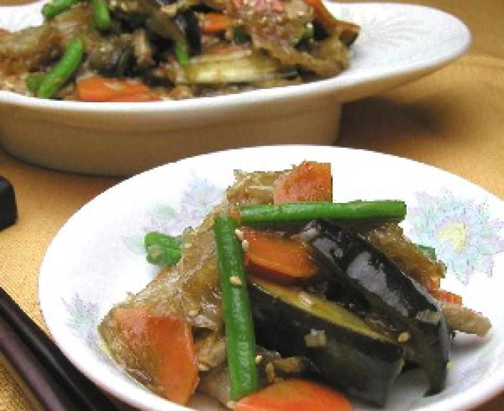 なすは縦半分、横半分に切ったものを3等分する。にんじんは2mm幅の薄切りに半分にする。いんげんは3等分に切る。