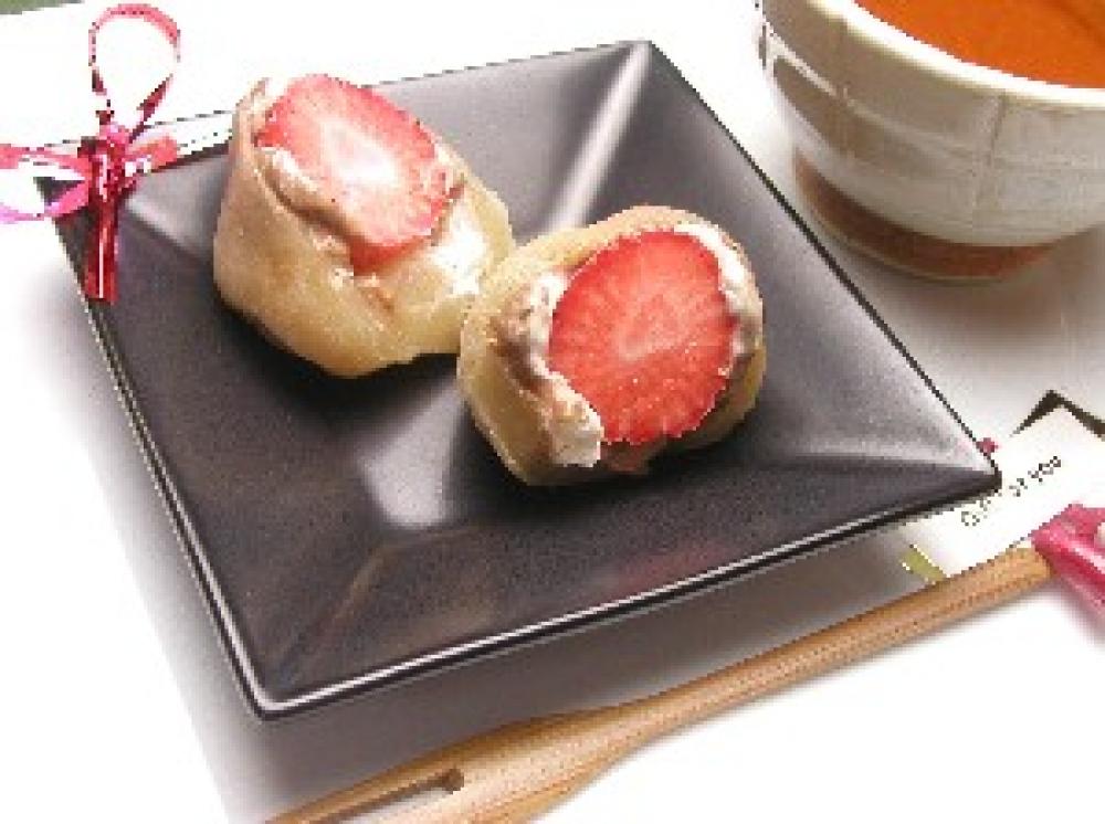 切り分けたぎゅうひにチョコクリームをのせ、中心にいちごを置いて包む。