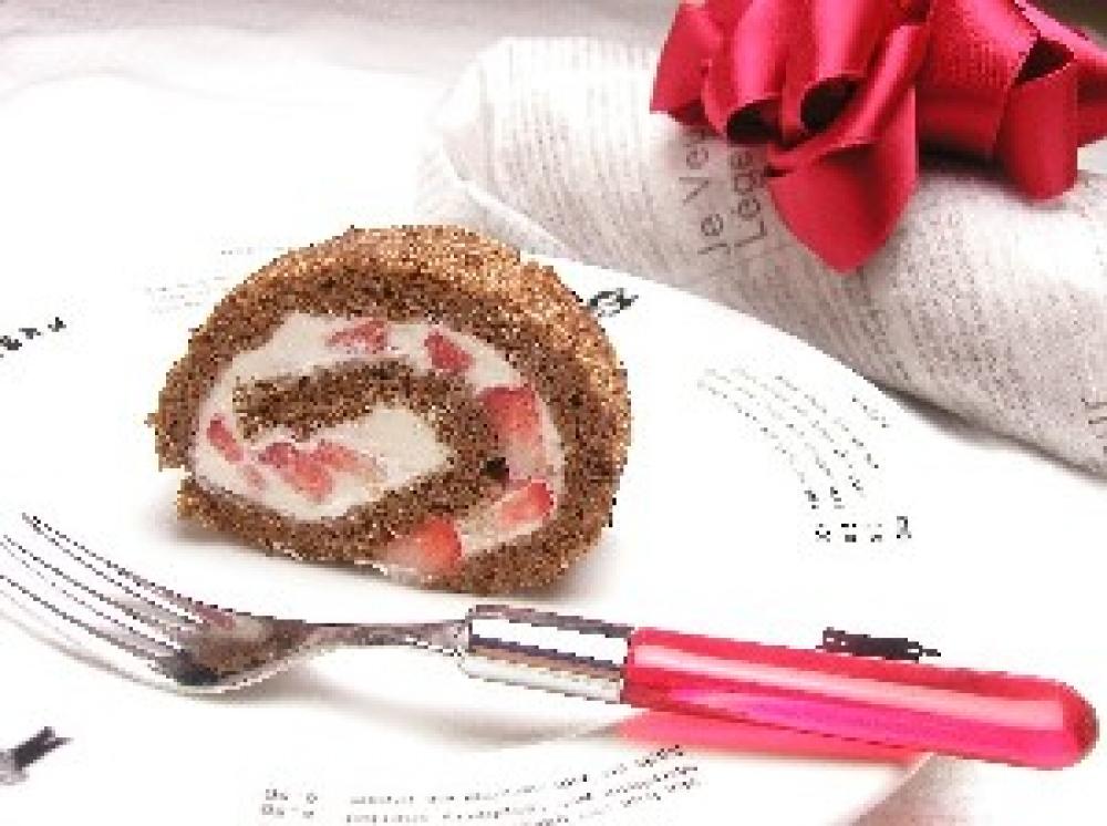 ロール生地の巻き終わり5cmを残して、いちごクリームを全面に塗り、しっかりと巻く。