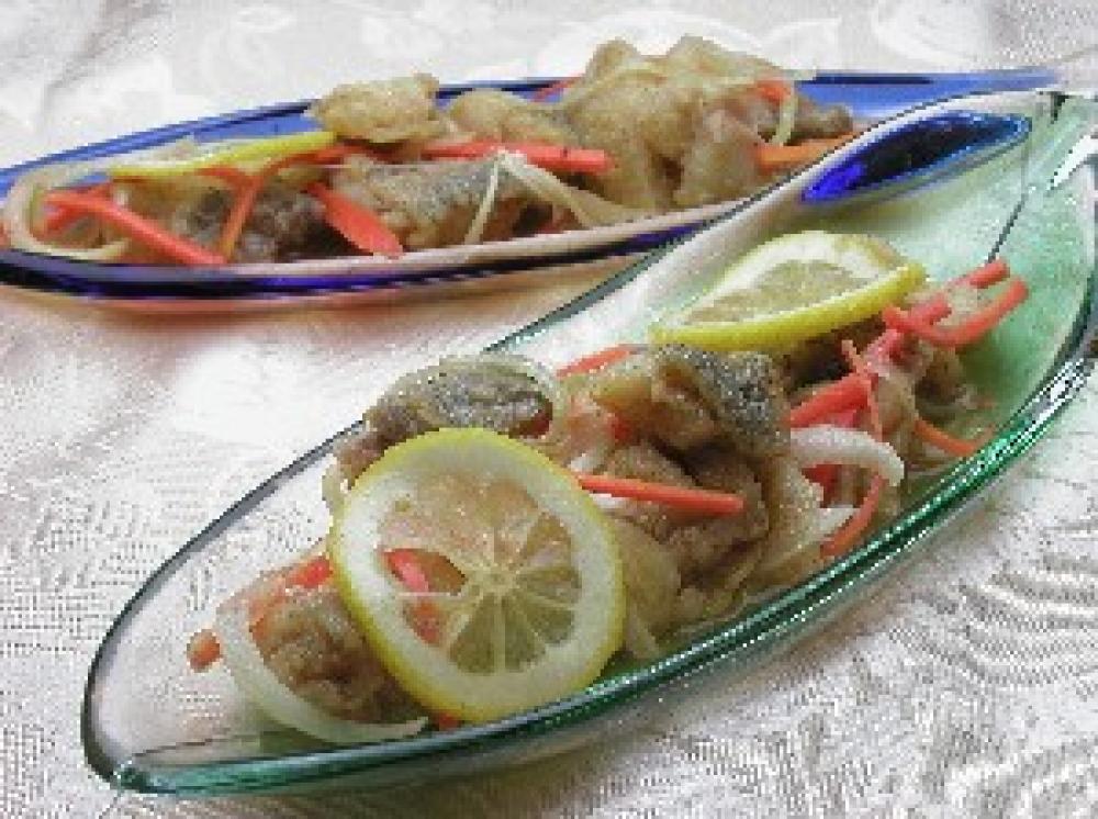 白身魚に軽く小麦粉をまぶし、揚げる。