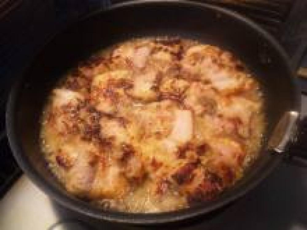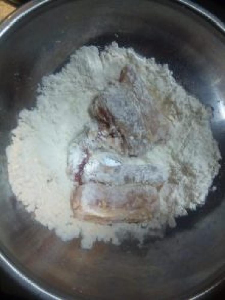 ![]() タレを拭き取り小麦粉をまぶす(ツケダレは捨てない)