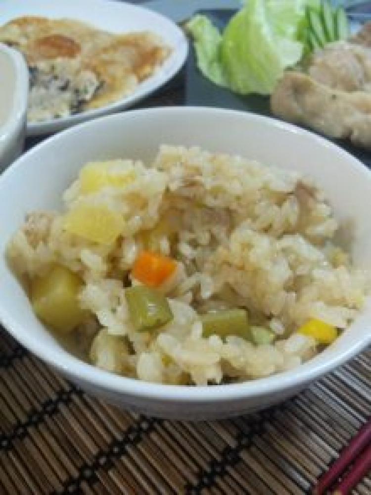 ![]() お米は洗ってざるにあげておく。ジャガイモは1センチくらいの角切りにし水にさらす。他の材料もみじん切りにする。