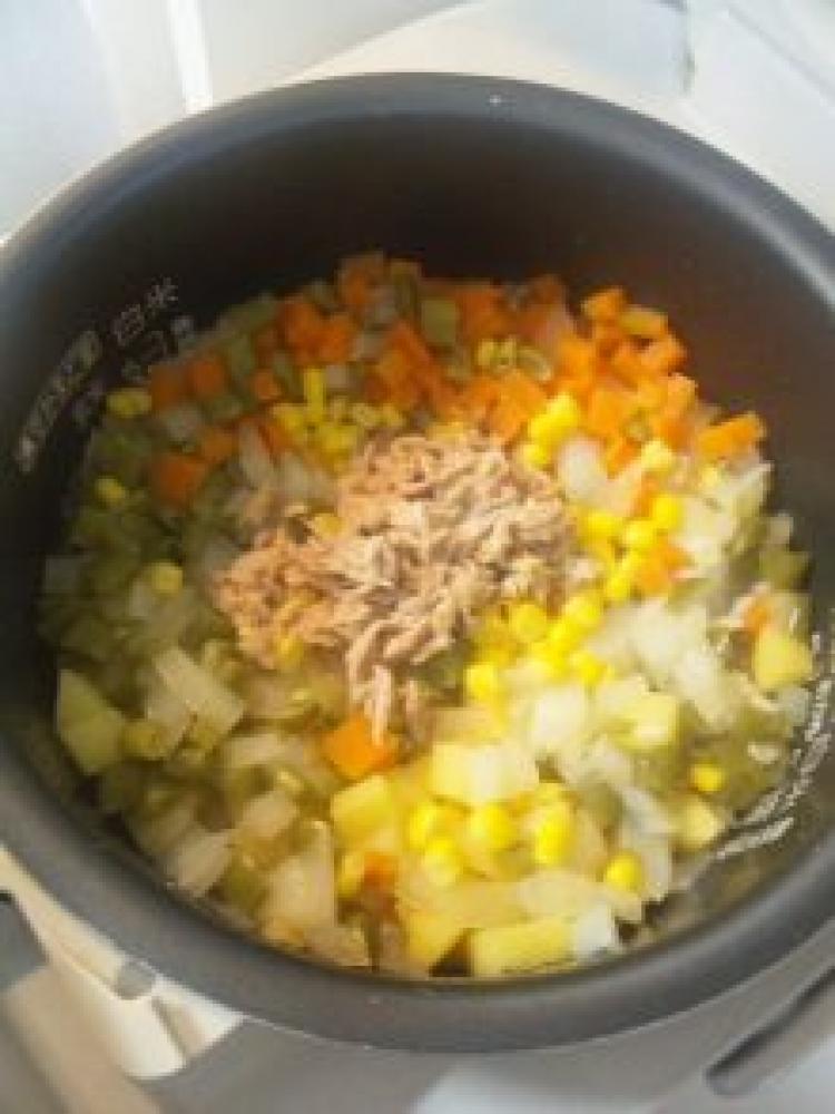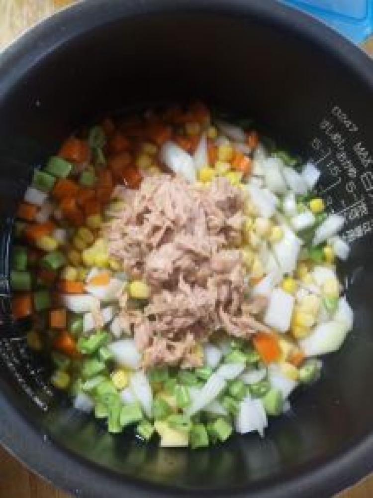 ![]() 炊飯器にお米を入れて☆と水を線まで入れたら(少なめ)野菜とツナを入れる。
