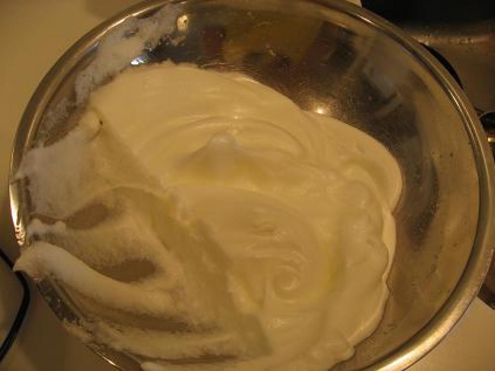 最初は何も入れずに高速で泡立て、残りの砂糖を加えてツノがたつように泡立てる。 |