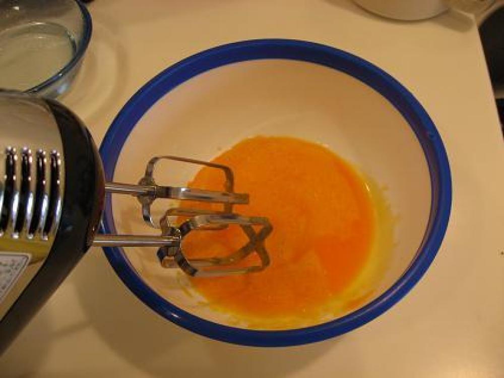 卵の黄身に砂糖を少しだけ入れ(10gくらい)白っぽくなるまで泡だて器ですり混ぜる |