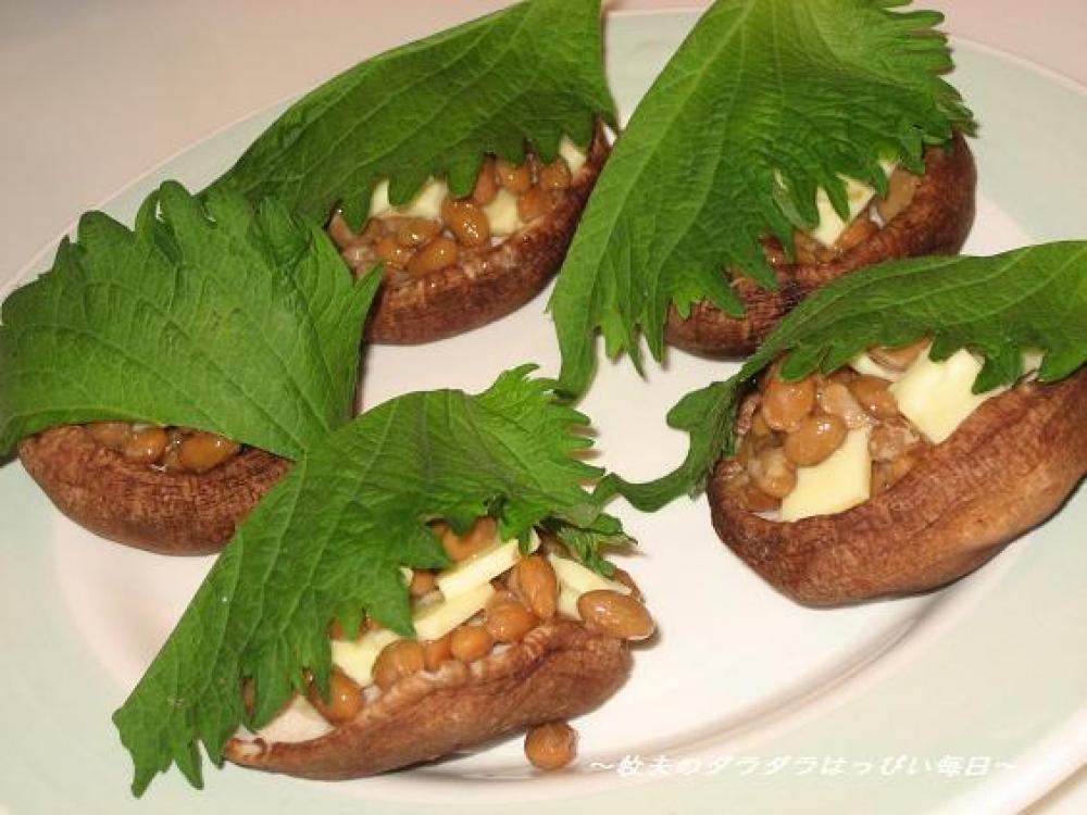 しいたけのかさだけにして、カサの中に、納豆とチーズをまぜまぜして、シソで覆います。