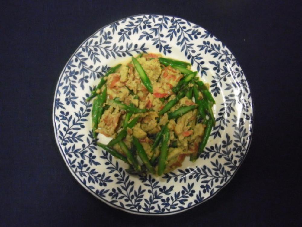 アスパラに火が通ったら、さっと分量外の塩コショウをし②の卵液を加え、全体に絡めるように混ぜて炒める。卵に火が入ったらOK