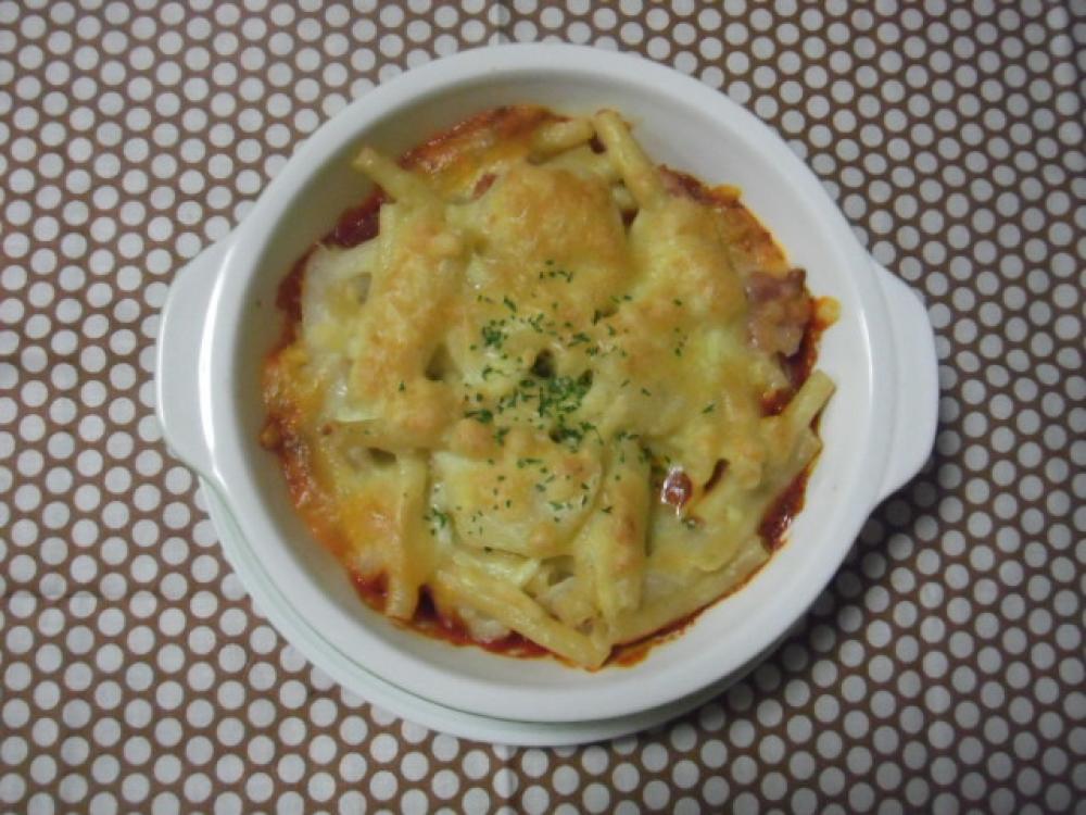 グラタン皿に薄くミートソースをしいて、②の具材をのせ、とけるチーズを上にのせる。
