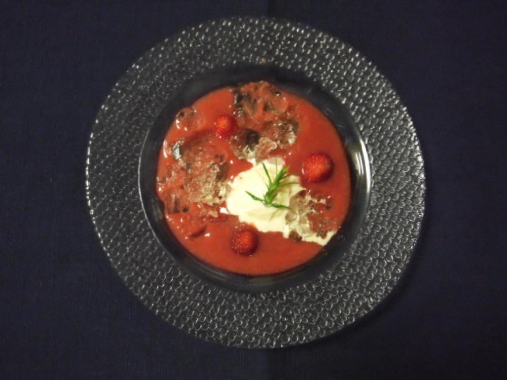 皿に苺のスープを注ぎ、バニラアイスをのせ、周りに白ワインのクラッシュゼリーと、トッピング用の苺をバランスよく飾る。