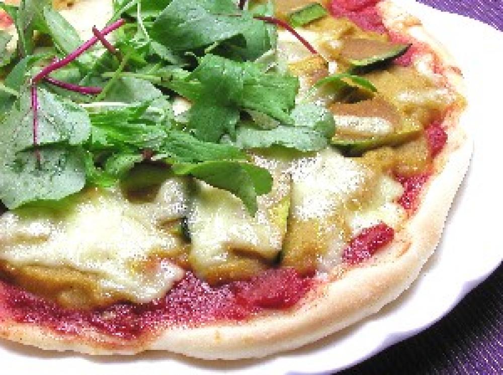 焼きあがったピザにベビーリーフをのせて出来上がり。