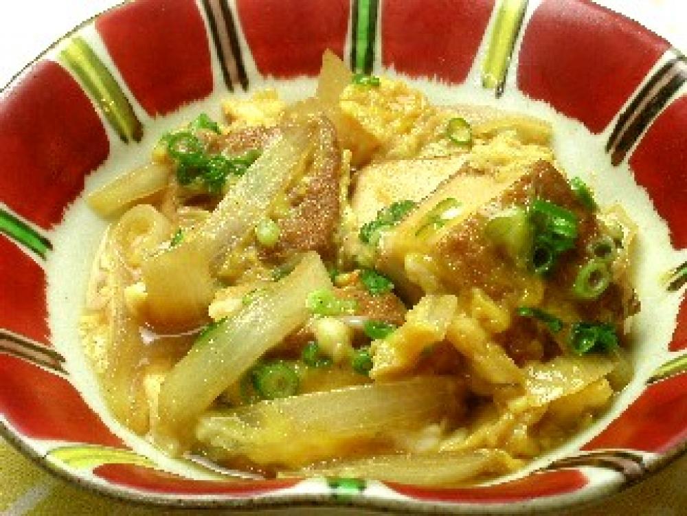 厚揚げに色が少しつき味がしみこんできたら、たまねぎを入れさらに煮込む。