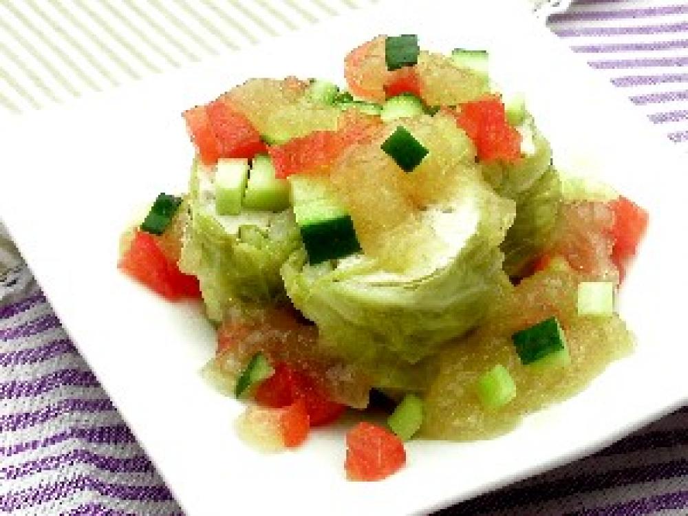 器にロールキャベツを盛り付け、上からコンソメゼリーをかける。