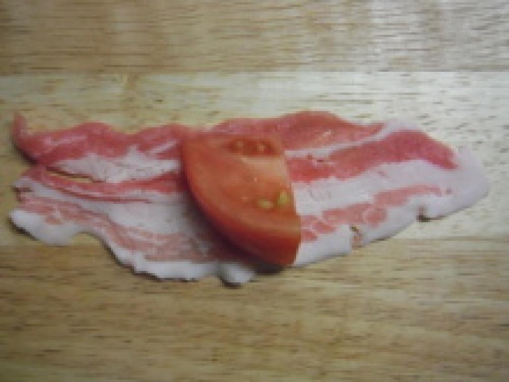 ![]() ①の切ったトマトを、薄切りの豚肉で包む。その時、縦方向からと横方向からの2枚で包むと、しっかり包める。