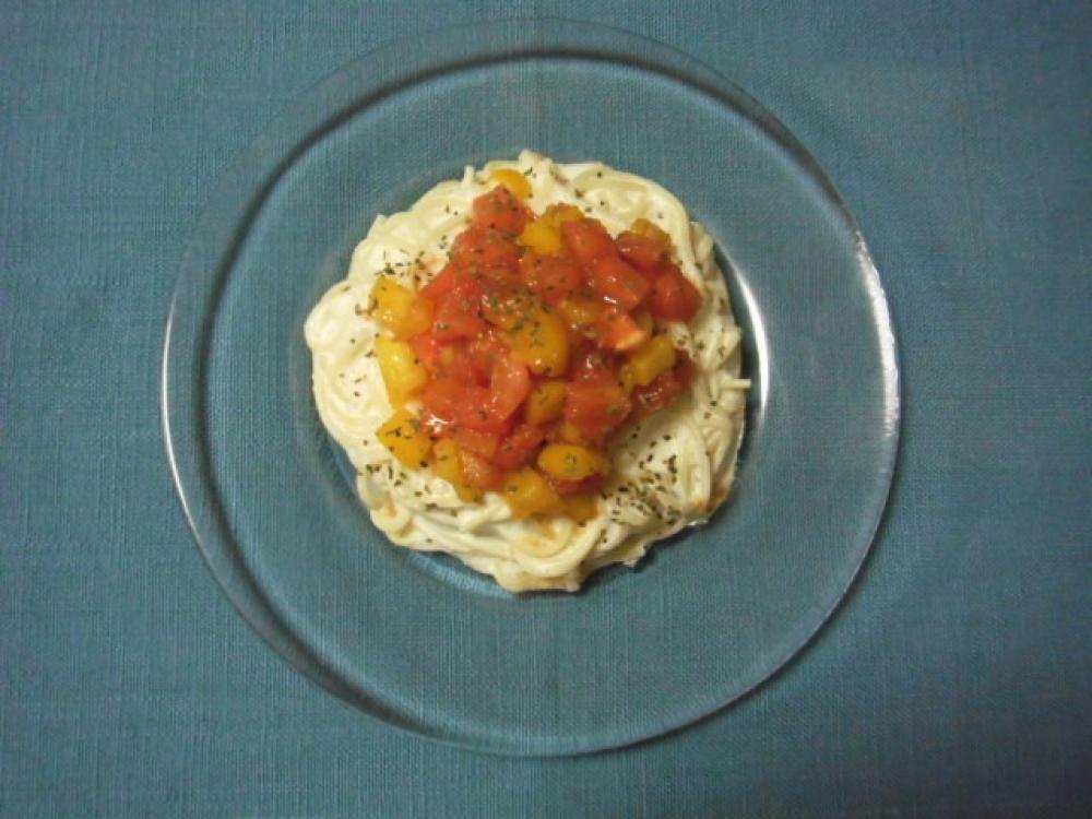 フェデリーニを⑤のクリームで和え、皿に盛り、④の野菜を盛り付け、乾燥バジルを全体にふりかける。